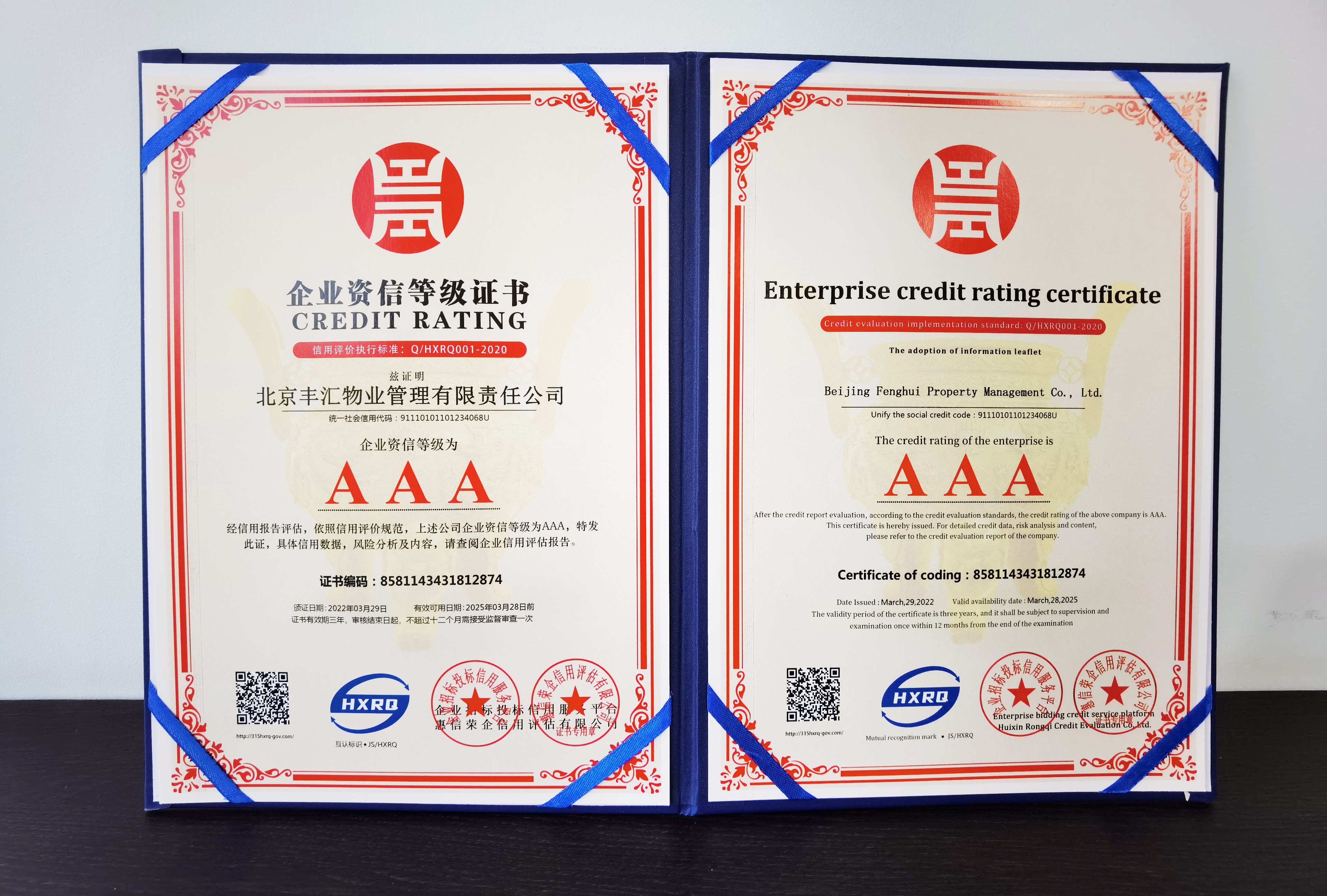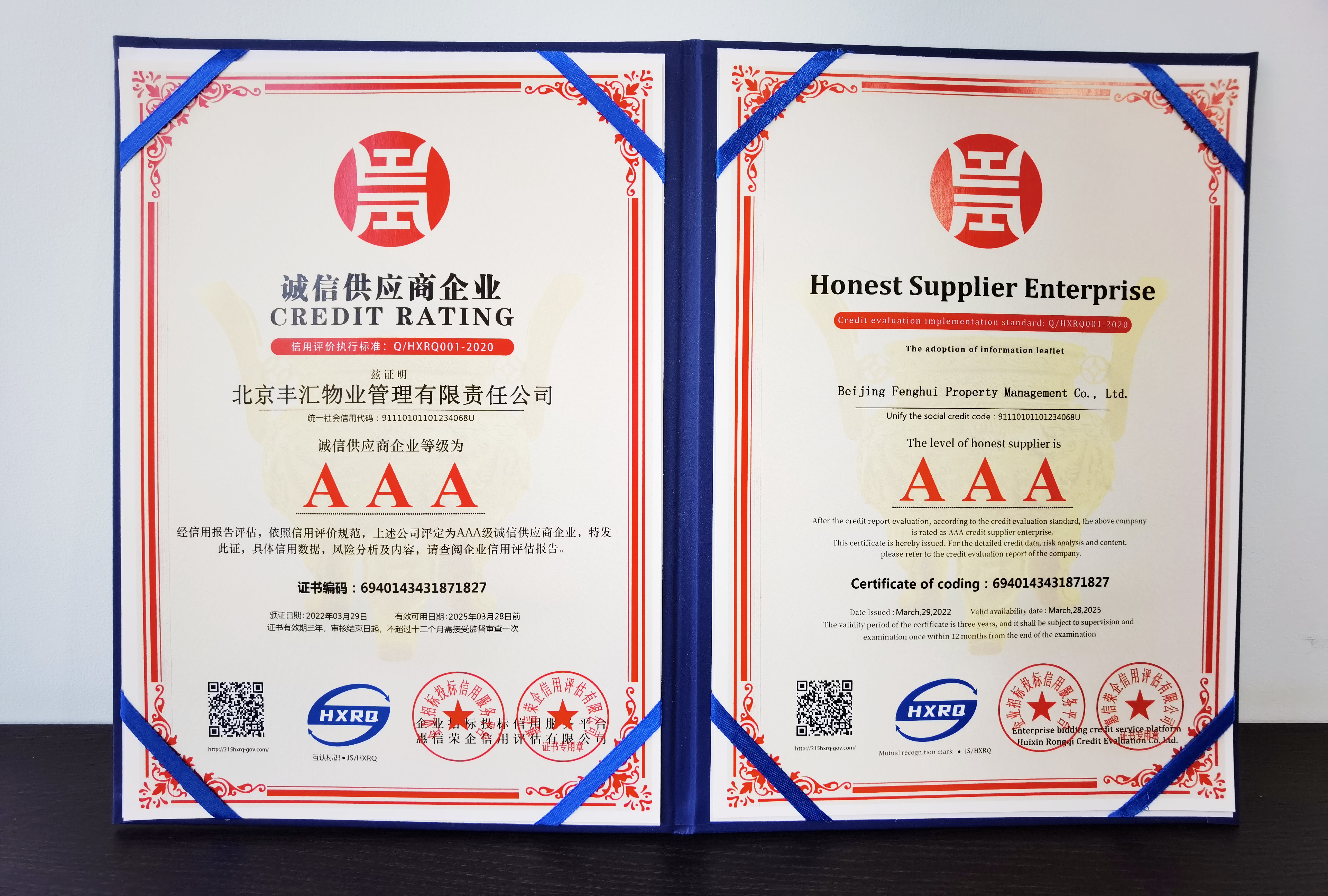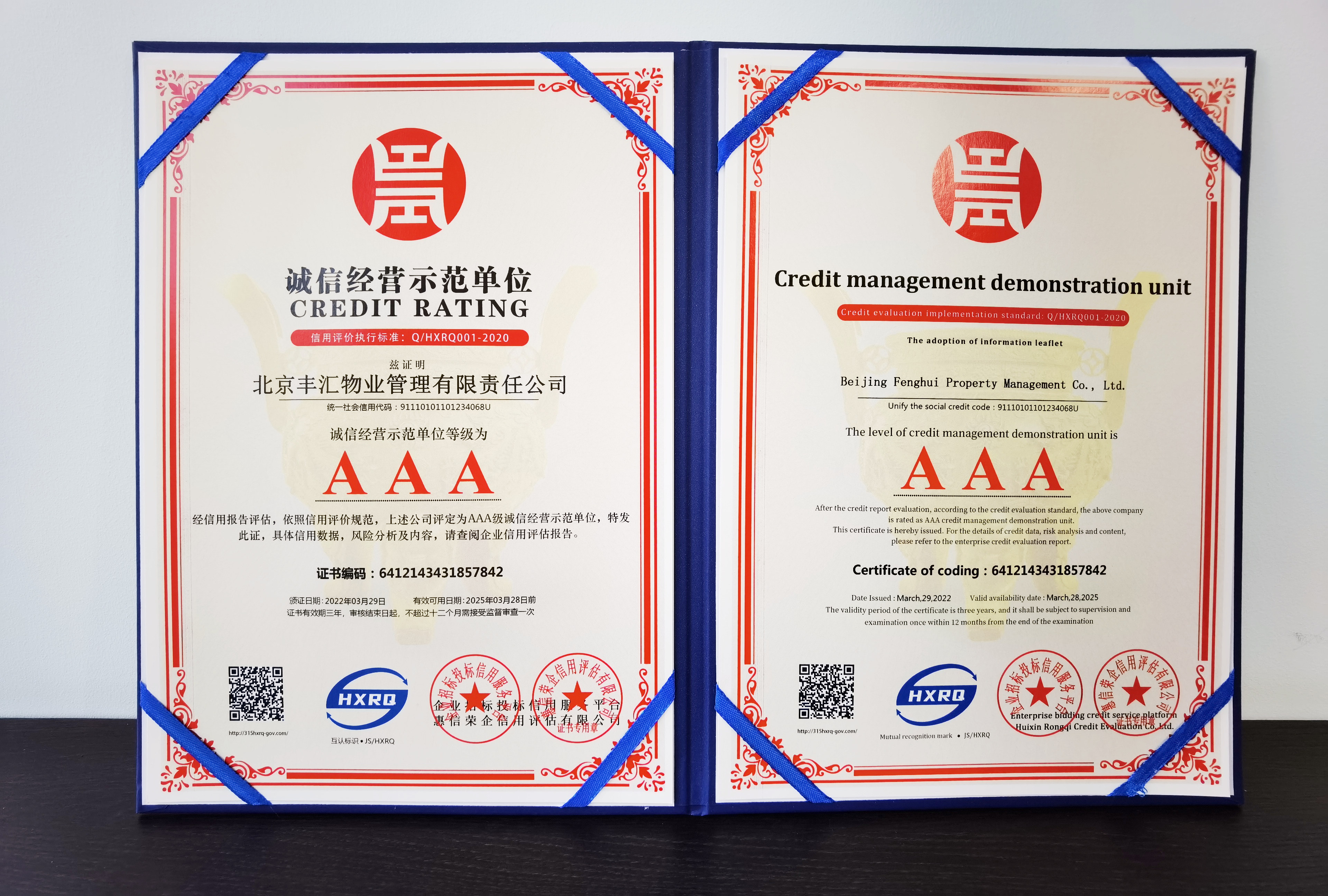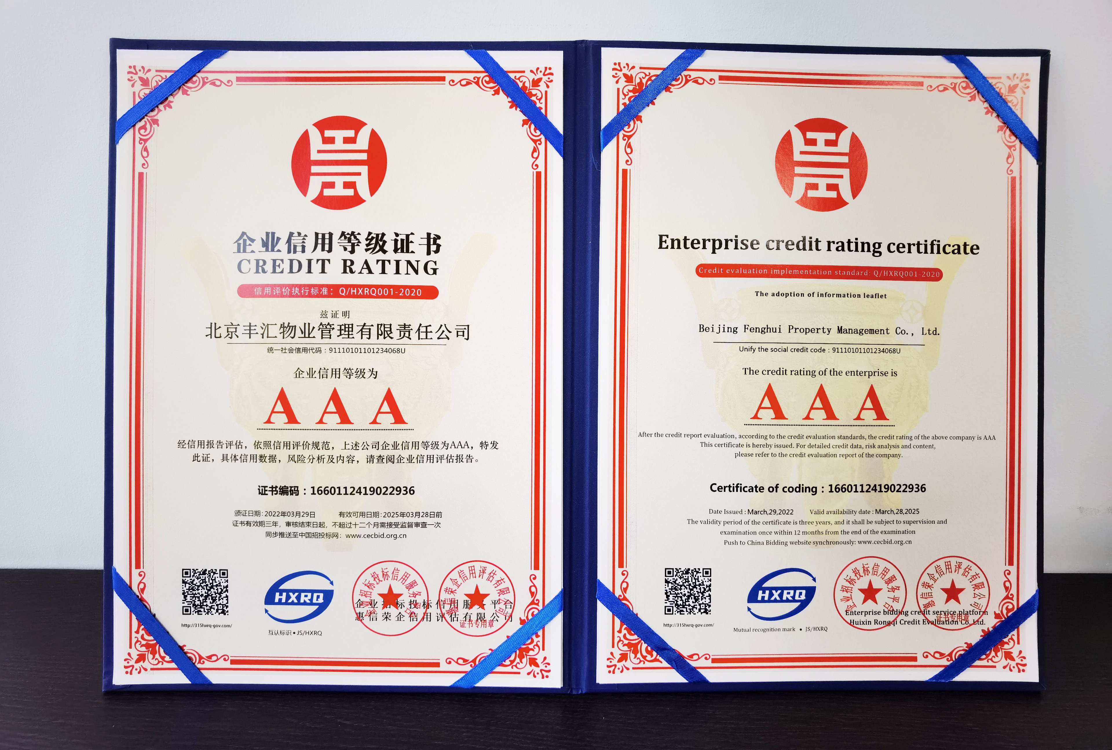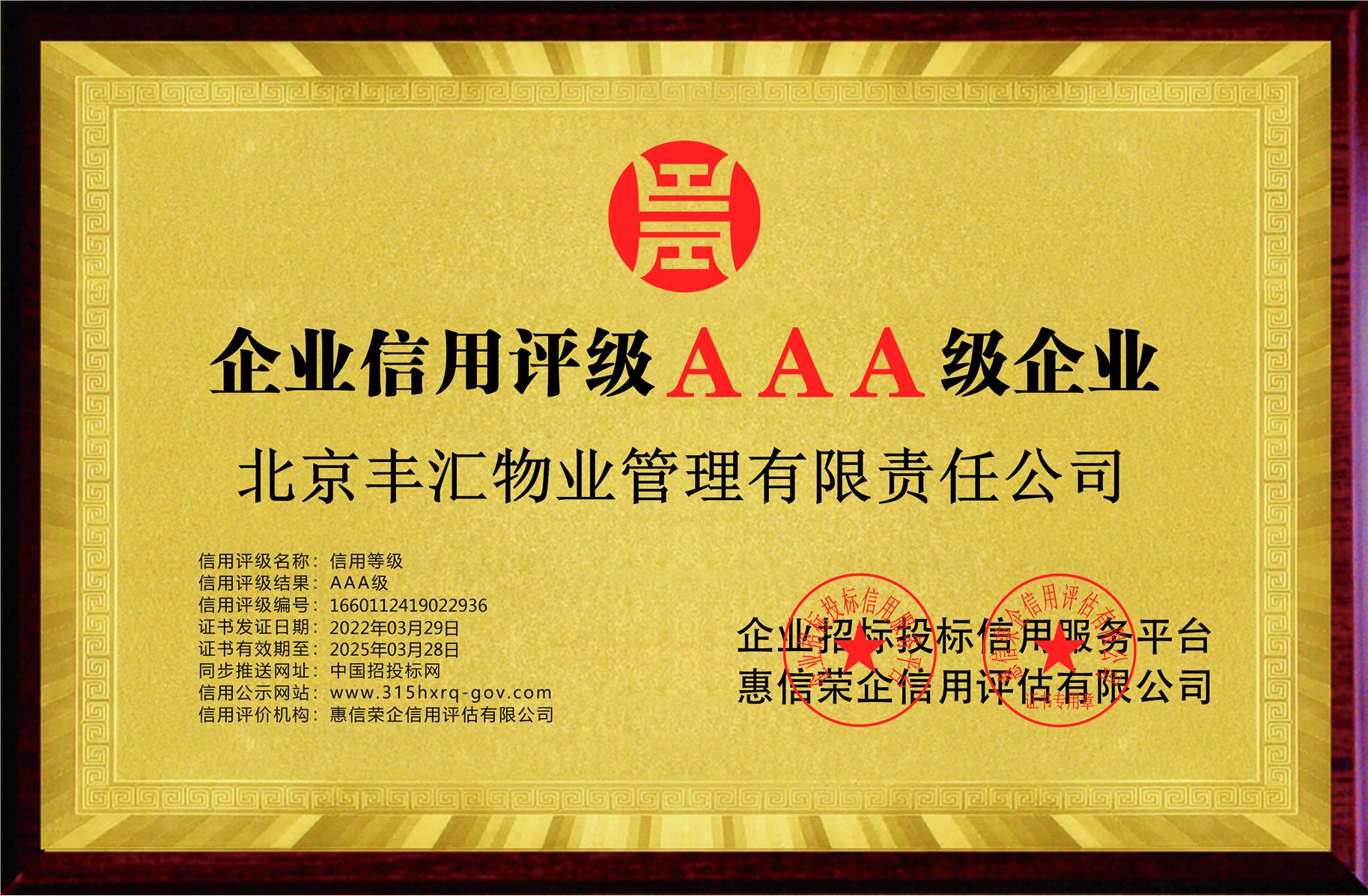 近日,北京丰汇物业管理有限责任公司被企业招标投标信用服务平台授予“AAA级”信用企业荣誉,这不仅是对丰汇物业公司知名度和市场信用度的认可,也是对丰汇物业始终坚持诚信经营,为广大客户和业主提供服务的充分肯定。